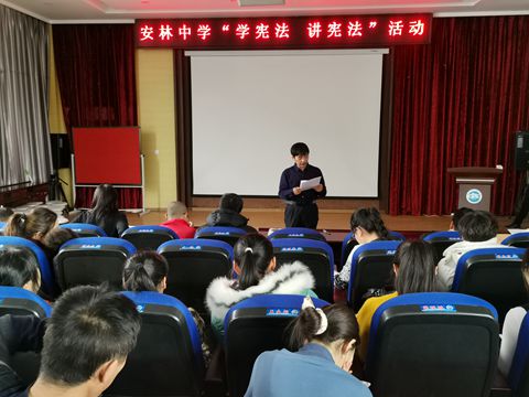 此外,安林中学还借助旗下演讲的形式,由八年四班赵子越同学进行了《做知法守法好公民》演讲;充分利用学校电子屏滚动展示宪法晨读内容,进行宪法宣传教育;利用校园广播资源播放歌曲《宪法伴我们成长》;利用晨读时间,各班分别进行宪法晨读活动;并统一组织七年级全体学生在大会议室观看教育部全国青少年普法网进行的网络直播——全国中小学生“宪法晨读”活动,同步参与了升旗仪式、宪法晨读跟读、合唱歌曲《宪法伴我们成长》、观看第四届全国学生“学宪法 讲宪法”活动获奖学生现场展演,及部级领导讲话等活动。八、九年级班主任利用班会时间组织学生进行宪法宣传教育,并进行了视频回看。全体班主任通过QQ及微信群,向班级家长也进行了宪法知识宣传。