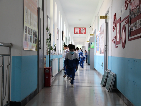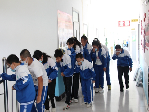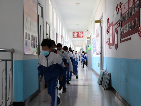 警报声响起几秒钟,走廊上立刻出现了同学们奔跑的身影,大家在老师的组织下迅速地逃离了教室,撤离的过程中,各位同学都尽可能地压低身形,沿着墙壁小跑,早已守候在楼梯口的各班班主任及负责安全的教师也各就各位,紧张而有序地指挥着同学们远离楼梯扶手靠墙疏散。很快大家就安全地抵达了指定的集合地点。