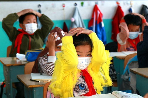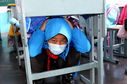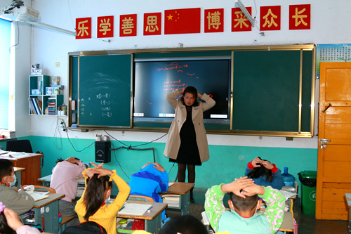 演练开始前,各班班主任对学生进行了地震发生时的安全培训。在教室里,学生们在老师的指挥下迅速抱头,以抱团的姿势蹲在各自的课桌下就近避震。
