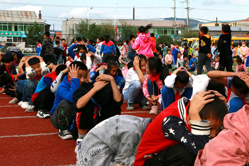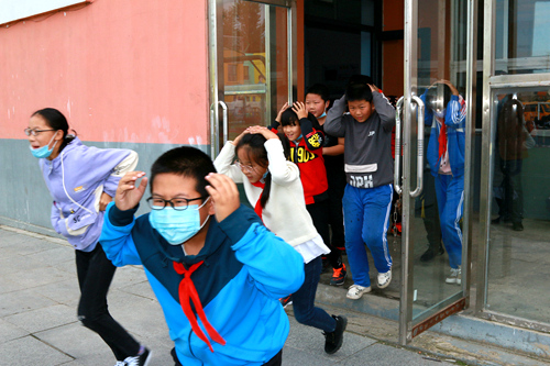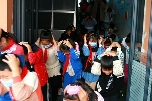 1:50分,随着“地震”信号的发出,在教室内上课的学生在授课教师的指挥下,立即将身体蜷缩,用手护住头部,迅速躲在课桌下进行应急避险避震。待“主震”结束后,两声长哨响起,千余名师生双手护头,快速有序撤出教室,并按演练方案规定的疏散路线迅速撤离到安全区域。从连续长哨声响起(发生地震,学生进行应急避震)到室外(疏散的集中地为远离教学楼的操场)集合结束用时4分钟11秒。演练中,师生配合默契、疏散路线清楚、组织有条不紊。