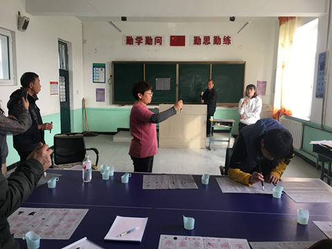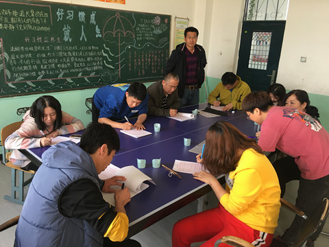 硬笔书法过关的九位老师主动选修了毛笔书法,研修活动中王培顺老师向学员详细介绍了毛笔字的基础入门知识,大家在王老师的指导下开始尝试进行基本笔划书写练习,并产生了深厚了兴趣。接下来王老师又对青年教师的硬笔书法进行了悉心指导,从基本笔画到间架结构以及整体布局做了深入浅出的讲解,经过培训和强化训练全体老师的硬笔书法技能都有了很大的提高。