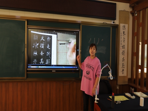 培训中,刘春艳老师用通俗易懂的语言从毛笔字的执笔方法、书写姿势、运笔方法等方面内容展开讲解,详细讲解了“横”的写法,并就自己在书法课中如何指导学生书写做了经验介绍。老师们全神贯注听讲,专心致志临摹,并针对自己在指导学生书写中遇到的问题进行交流。校书法教师还现场进行了巡回指导,发现问题及时纠正。老师们练字热情高涨,虚心静听,用心揣摩着写字方法,整个培训过程中充满着浓浓的学习、研究、欣赏的氛围。
