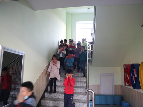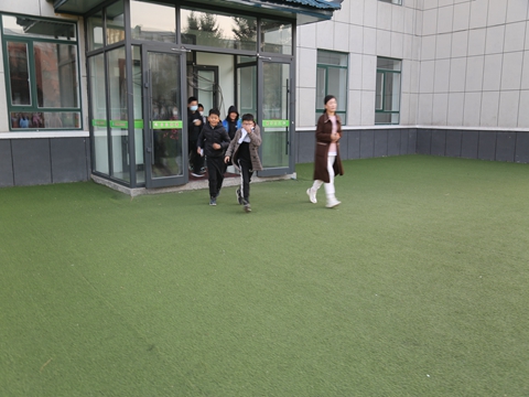 随着警报的响起,各位老师及时准确到达指定位置,马上组织学生,迅速进入紧急疏散状态。班级内的任课教师快速安排学生做好疏散前的准备,在老师的带领下,全体学生弯着腰,用手帕捂住口鼻有序撤出教室,在楼层引导员的指领、楼梯拐角安全员的提醒下,根据演练方案中规定的路线,沿着学校指定楼梯口快速疏散,有序撤离到学校操场,并蹲好。随后各班班主任清点人数,并层层向上汇报。全校师生全部安全疏散,整个过程紧张有序,收到了预期的效果。校安办主任张颖对此次疏散演练活动进行了总结,提出了学校安全工作的进一步要求。