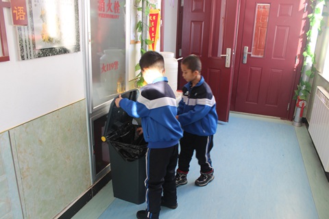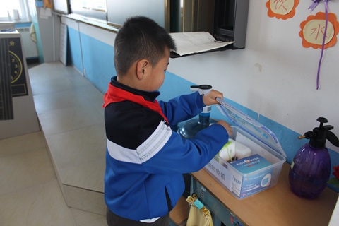 双“线”即走好1米间隔线、走好活动规划线。班主任指导学生进出校门、上下楼梯、错时洗手、文明如厕、取餐倒餐时,保持1米的安全间隔线;进出校门、室外活动,按照特定的时间和路线,统一有序行走。规划点线,严格训练,始终遵循班级是最大的聚集体的原则,避免交叉。“包”则指的是防疫包、垃圾包和学习包。“防疫包”中每天放着家长为孩子们准备好的口罩、消毒湿巾、水杯等防疫用品。借助“垃圾包”,学生学会垃圾分类、餐盘倾倒、口罩置放、课桌消毒、卫生打扫等操作规范。德育处还为孩子们准备了一个“学习包”,制定好每天早上的“十分钟防疫主题教育”计划,分期推送心理健康教育、学习“抗疫英雄”人物事迹、防疫知识学习等方面的主题教育内容。