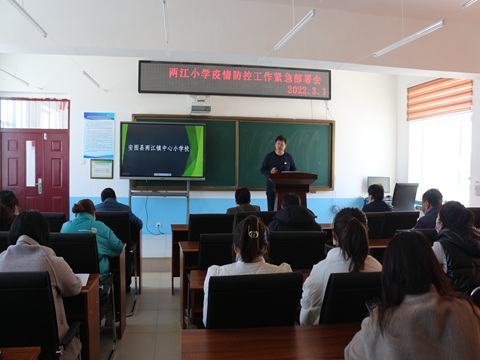 3月1日上午,两江小学校长牛建军、副校长张宝军、安全主任卢广强和校医单云华在参加县教育局组织的线上新冠疫情防控工作部署会后,立即组织全体教职工召开两江小学疫情防控工作紧急部署会。会上,牛建军校长传达了上级对于疫情防控工作的部署和安排,并再次明确校疫情防控领导小组责任分工,就本次演练的重要性、防疫的紧迫性、防控流程落实的关键性作出强调,要求各部门本着对师生健康负责的态度,开展好演练活动。校医单云华老师对此次演练进行了培训。
