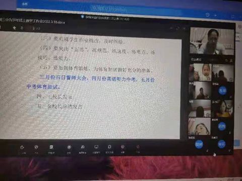 为更好的把握九年级中考复习工作,第一时间了解九年级线上教学情况,3月18日晚7点安图三中召开了九年级线上教学工作会,本次会议由教导处李娟主任主持,全体九学年教师及校领导共同参加。