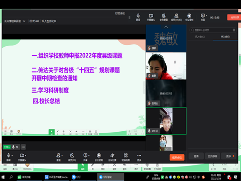 会议组织学校教师申报2022年度县级课题,传达了传达关于对各级“十四五〞规划课题开展中期检查的通知,还共同学习了科研制度。