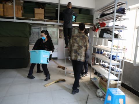 参与劳动的男教师们戴着口罩,进校测温、登记后,以分区域的形式,对校园库房、体育仓库、绿化带周围等重点区域,进行全方位清理打扫。在清理库区杂物,东西都很沉重,但是没有一位教师喊苦喊累,体育仓库里不仅规范了物资摆放位置,更彻底消除安全隐患。几位男老师一起对教学楼内的灭火器进行了彻底的检查、清理和维护,并对对办公室、楼梯扶手和楼道的外墙进行了清理。劳动过程中,大家干得热火朝天。即使汗流满面,大家也依然热情高涨,以劳动为荣,乐在其中。经过三个多小时的辛勤劳动,教师们清扫出垃圾数桶,整个校园环境焕然一新。
