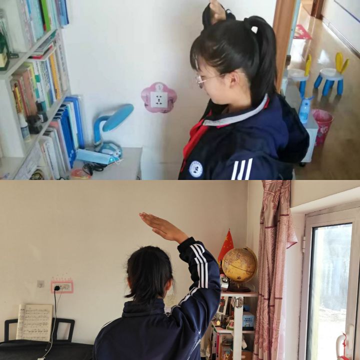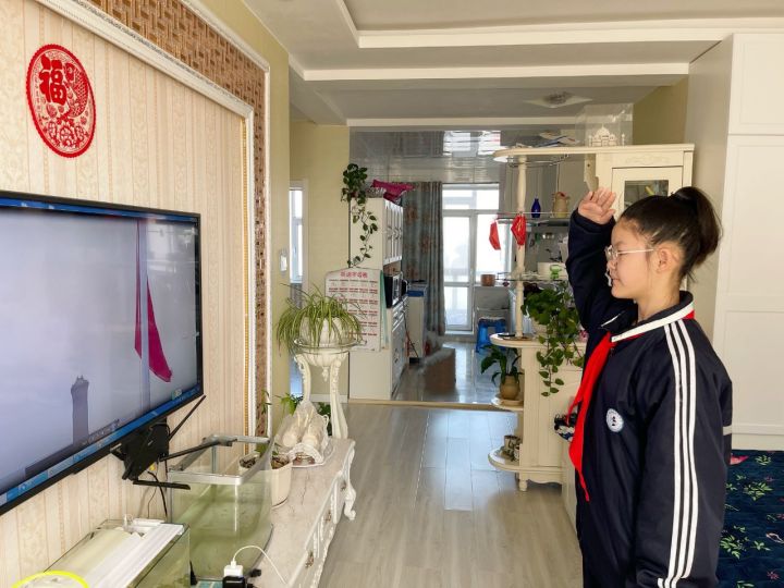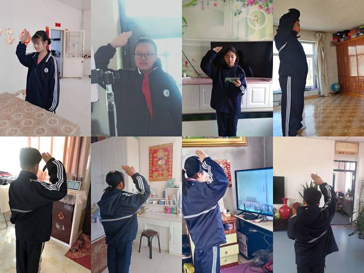 上午7点30分,同学们准时“隔空集合”,用“线上升国旗仪式”这种特殊的方式向祖国致敬,为吉林加油。当熟悉的国歌响起,全体同学高唱国歌,在大大小小的屏幕前,凝神注视五星红旗冉冉升起。不同的空间,却在同一时间里,一股股爱国的暖流,在网络上升腾汇聚。