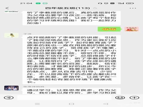 本次讲座,李兆良教授从居家学习时孩子的种种表现给家长带来的焦虑为切入点,讲到“孩子不是问题,孩子的问题不是问题。父母对待孩子,以及对待孩子的方式、方法和态度才是问题。” 阐明了在疫情期间,孩子需要持续待在家里,外出活动减少,他们的负面情绪也可能会持续累积和积压。请家长理解孩子的负面情绪,及时进行正面疏导和缓解,教会班主任及家长们如何识别学生的心理健康状态,怎样从认知、情绪、行为、生理等四个层面调节心理健康水平,授课内容直抵核心问题,引人深思。讲座后,各班级在班级群里交流了学习后的反思与心得。家长们的一段段文字,写出了收获,写出了反思,写出了触动,大家都感觉从讲座中收获良多。