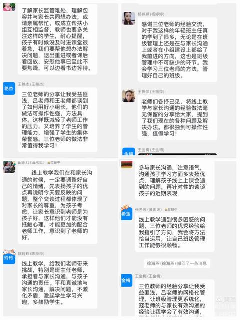 全体班主任认真聆听了三位老师的分享,都感觉深有收获。在今后的班级管理中把吕美英老师的工作方法作为预设,把王学平老师的工作方法作为过程性的查漏补缺,把寇红老师的沟通技巧作为单点击破,让工作干起来会更加游刃有余!会后,校长佟晶在总结中表示,相信每一位班主任老师在班级管理中都有各自的小妙招,做好家校沟通工作,服务好学生,服务好家庭。