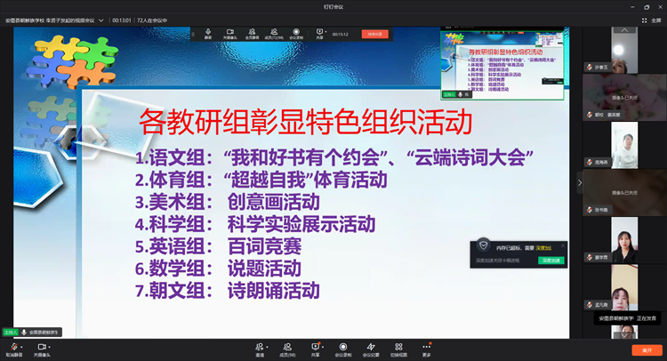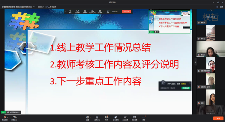 进行线上教学活动已经一个月有余,而疫情的影响仍未停止,及时归纳整理相关教育教学活动经验、提炼优秀案例中的先进做法、开展丰富有趣的线上活动、合理制定下一阶段教育教学工作计划变得十分必要,4月19日下午十三点整,安图县朝鲜族学校教职工大会暨线上教学工作例会准时召开。