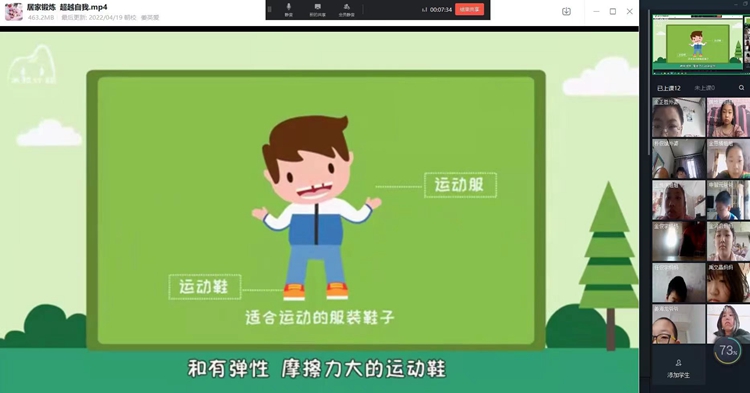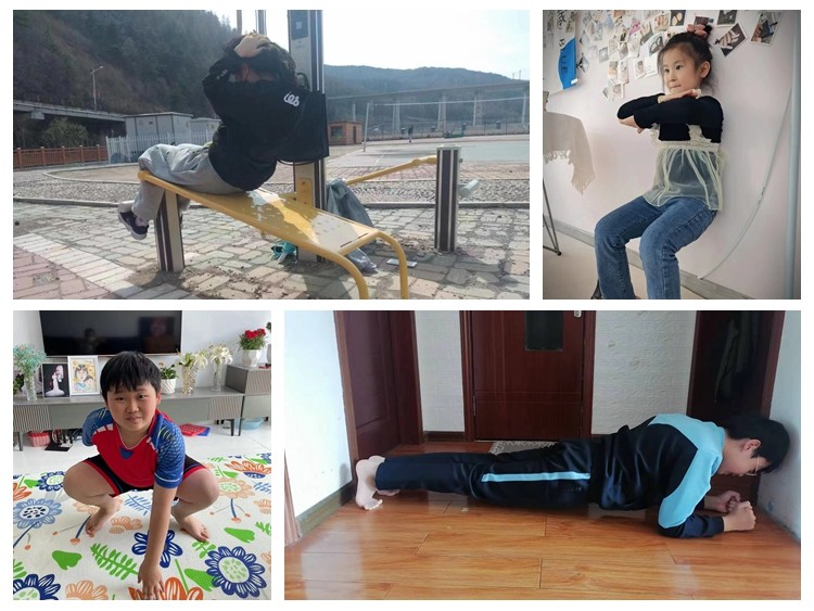 本次体育专项活动由朝鲜族学校政教处组织,体育组教师全程参与并进行指导,包括启动仪式、准备阶段、超越阶段、评比阶段共四个节点。4月20日上午七点半朝鲜族学校全体学生以班级为单位,由各班班主任主持召开“居家锻炼 超越自我”体育专项活动启动仪式。班主任通过讲解使学生明确本次活动的目的以及各个阶段的具体任务及要求,并通过播放教学视频的方式让学生学习各个运动的标准动作。根据学生年龄差异,各班级体育教师以年级为单位选择了不同难度的运动项目并归纳成运动清单下发至学生手中。如一、二年级为靠墙静蹲20秒或四点支撑20秒、三、四年级为深蹲开合跳10个或平板支撑20秒、五、六年级为一分钟跳绳70个或平板支撑20秒。学生每天每天利用课余时间在家锻炼并按时填写运动清单,同时以拍摄照片或视频的方式进行影像资料的记录,活动期间上传的影像资料由各班级体育教师进行收集。