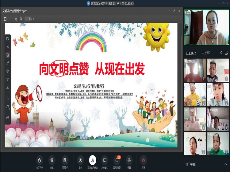 文明礼仪是中华民族的传统美德,从古至今,源远流长。长期以来被人们作为衡量为人处世的道德标准之一,是一个人道德修养的外在表现。为了营造文明待人、阳光向上的校园氛围,让同学们自觉养成讲文明、懂礼貌的好习惯,让文明之花开满校园,两江小学在4月21日组织全校16个班级开展了“文明礼仪教育”线上主题班会活动。