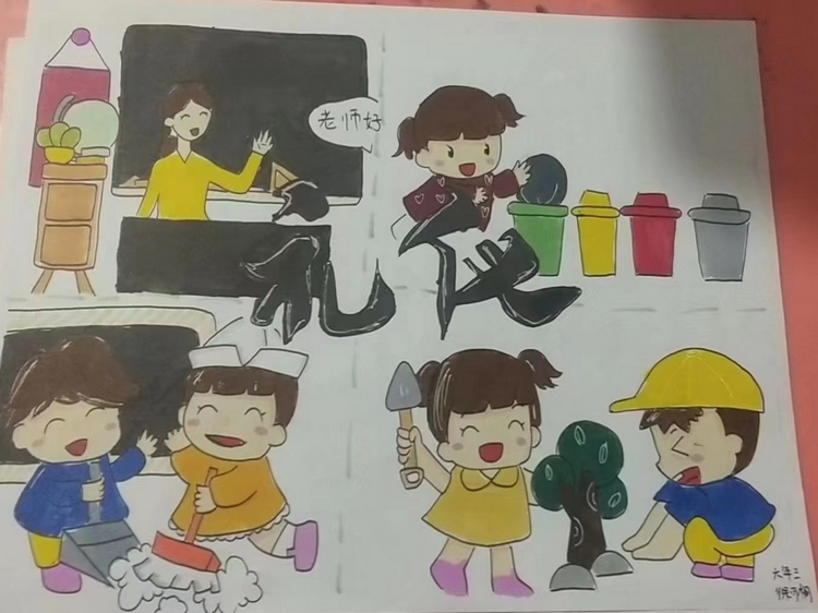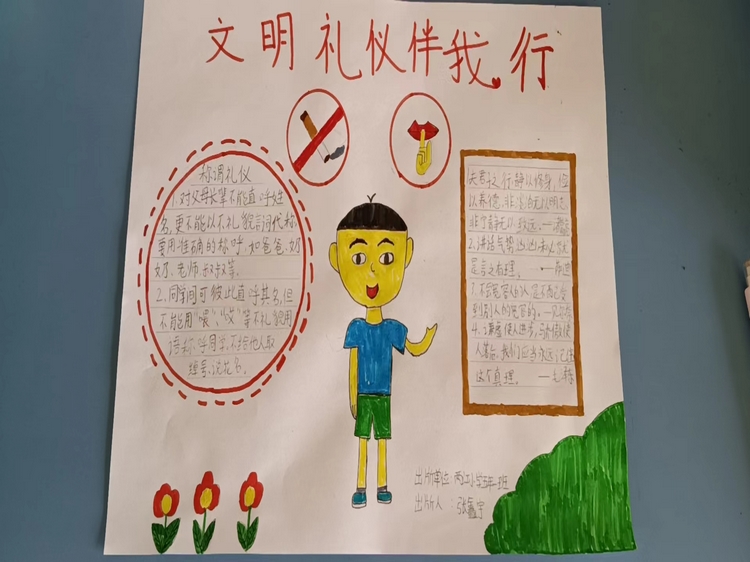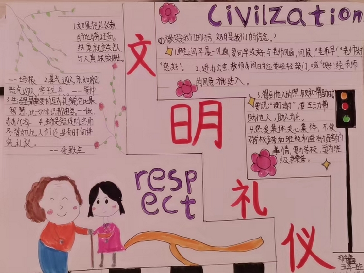 主题班会中,各班主任根据各年龄阶段学生的身心发展特点,有针对地以生活中的案列为突破口,引导学生学习生活中各种文明礼仪用语、行为规范。在“文明礼仪”主题班会活动中,有的班观看文明礼仪宣传视频,形象生动地表现文明礼仪在生活中的重要作用;有的班诵读学习规范,生活规范,人际规范等等;有的班展示不良的行为习惯,让学生明白了哪些不是文明行为……随后,两江小学的同学们现学现用,在家开始了家庭礼仪实践活动,或是有礼貌的待人接物,或是给劳作了一天的家长端上一杯热水,或是用巧手绘制出一幅幅精美的儿童画,展示出一个个讲文明,懂礼貌的瞬间,向大家宣传“文明”这一传统美德。高年级同学们精心制作出一幅幅“载满”文明行为的画报,书写文明行为,以身作则,为学弟学妹们做榜样。
