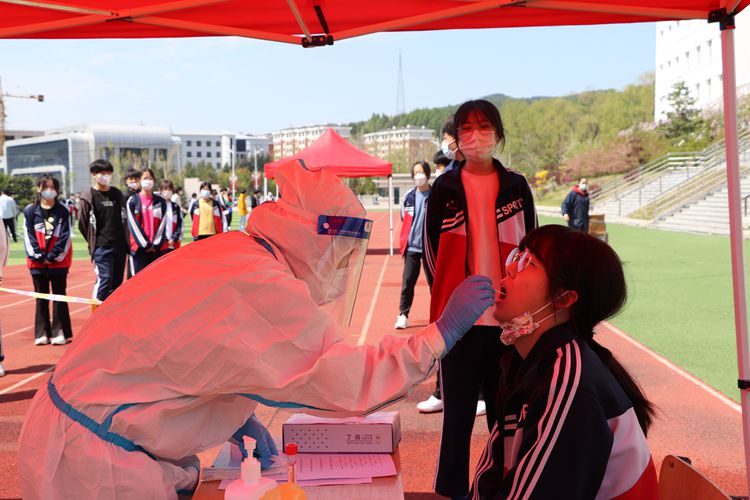 全体高三学生在班主任的带领下,以班级为单位,依次到操场空旷场地等候。学生自觉佩戴口罩并保持一米距离,经过测温及登记后按照分组依次进入采集区进行咽拭子采样,采集结束后,在指定通道陆续回班,避免交叉、聚集。教师自采队伍身着防护服,严格按照检测规范流程进行核酸采样。本次核酸检测共计238人。