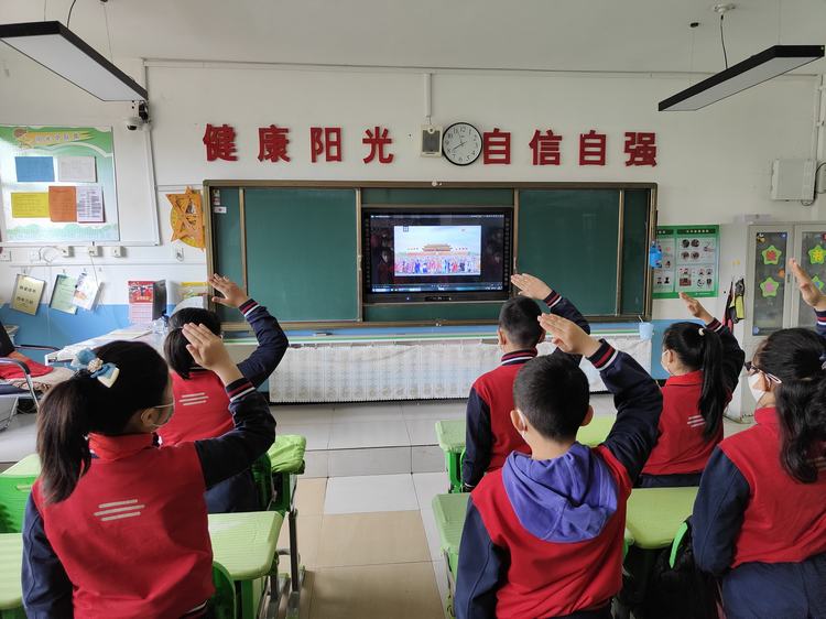上午7点50分,师生们身着校服,脖系红领巾准时守候在班级。操场上国歌奏响,升旗手有力地扬起国旗,五星红旗冉冉升起,全体师生各自肃立,向国旗行注目礼。虽说是室内升旗,但是同学们一样用饱满严肃的精神状态去认真对待,伴随着庄严激昂的国歌,五星红旗冉冉升起,孩子们歌声嘹亮,既唱出了他们对祖国的热爱、也唱出了对战胜疫情的决心。大队辅导员褚爱娣在讲话中回顾了学校实施全封闭管理以来,全体师生顾全大局服从命令、听从指挥的优秀品质和舍小家为大家的大爱情怀。她呼吁全体师生继续做好个人防护,戴口罩、勤洗手、不聚集、通风消杀,要珍惜现有的阶段性成果,珍惜当下的校园生活,共同守住这个春天,迎来美丽夏天。