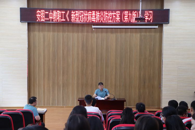 为及时掌握新冠肺炎疫情防控最新政策,提高疫情防控的科学性、规范性和精准性,8月25日,安图县第二中学组织召开《新型冠状病毒肺炎防控方案(第九版)》学习大会。全校教师参加会议。