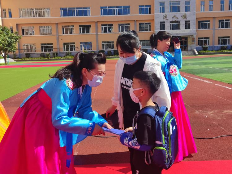 上午九点,伴随着轻快的音乐,入学典礼拉开了序幕。一年级新生以及家长通过测温门后,首先映入眼帘的就是州庆70周年吉祥物龙龙,小同学们兴奋的与龙龙进行合影留念。副校长刘红艳站在“红星闪闪 筑梦起航”迎新背景牌前,指挥工作教师为孩子们留下一张张珍贵的合影。全体教师身着朝鲜族盛装,在红毯两旁,挥动着彩旗,欢迎一年级小同学。一年级小朋友在爸爸妈妈的带领下一起走上象征着学习之路的红毯,迈出了求学坚实的第一步。校长佟晶和副书记周红新站在智慧门前,迎接着孩子们的到来,为每一位小学生赠送经典诵读读本,并祝贺孩子们成为一名小学生,希望孩子们努力学习,快乐成长。