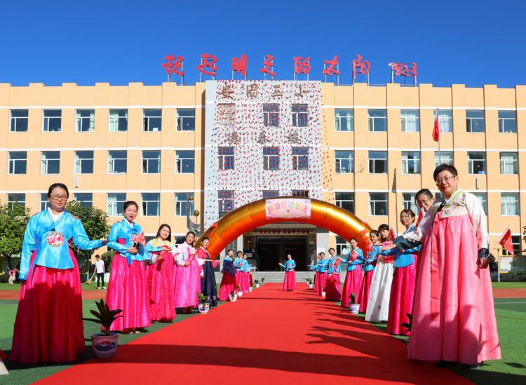 清晨,学校班子成员在校长的带领下,着朝鲜族民族服装,站在校门前,迎接师生入校。蔚蓝的天空,喜庆的氛围,真诚的笑脸,热烈的拥抱,温馨的祝福和鼓励,使师生满怀欣喜的返回校园。
