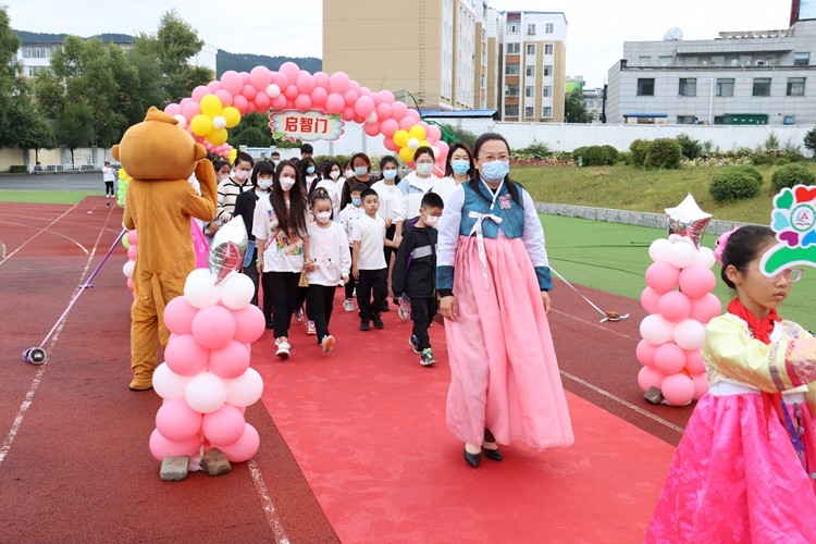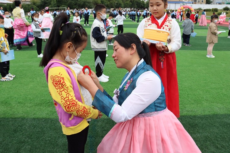 伴随着欢快的音乐,在三位班主任老师的带领下,93位一年级的小朋友以班级为单位,依次通过象征启心明智的“启智门”,并由学校领导为小朋友们佩戴带有朝鲜族学校校徽的“启智之花”,同时为学生发放成长记录册,方便学生与家长记录学生小学六年的点点滴滴。随着新生在操场列队完毕,新生入学仪式正式开始了,升国旗 、唱国歌,朝鲜族学校校长金正一致辞,入学宣誓,班级合照留念。