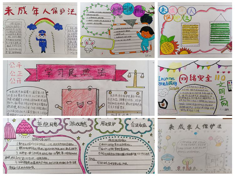 为让每一位同学都能够接触到法制教育,要求每个班级都要出一期关于法制教育方面的手抄报,内容以《未成年人保护法》、《预防未成年人犯罪法》、《绿色网站》、《民法典》等相关法律、法规为主。