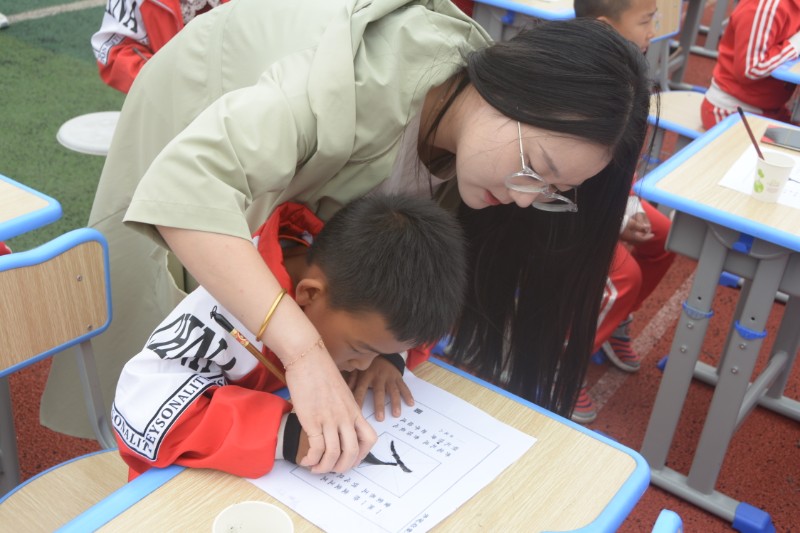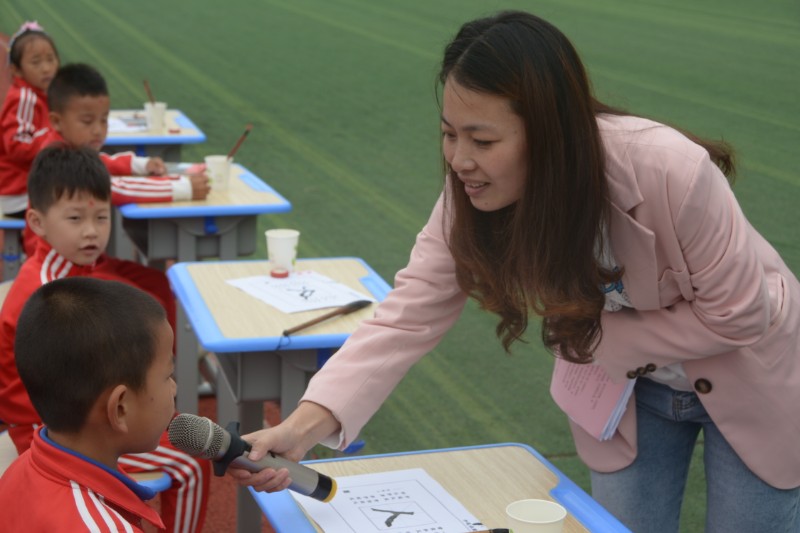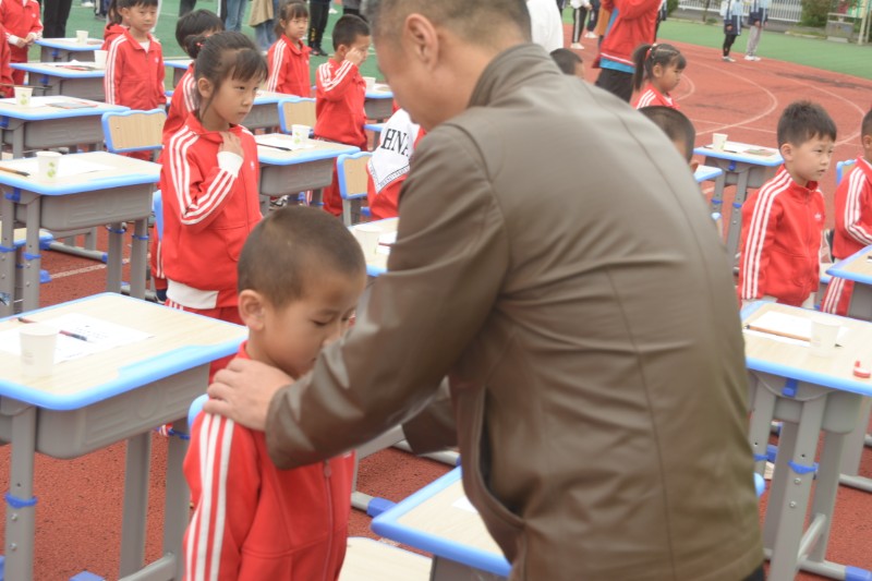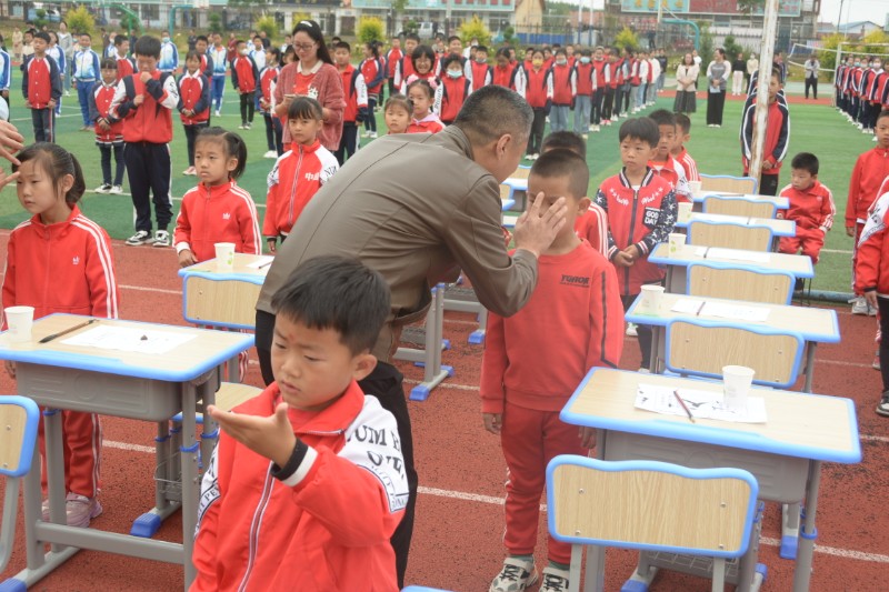 紧接着政教处秦主任主持了开学典礼的开笔仪式,第一项:正衣冠,分为学生自正、学生互正、教师帮正。古人云:“童蒙之学,始于衣冠;先正衣冠,后明事理”。第二项:朱砂启智。王校长、张书记、臧副校长以及班主任老师为一年级新生点上红痣,并送给孩子祝福。第三项:击鼓鸣志。王校长带领一年级的小朋友依次击鼓,以此表明自己的志向。第四项:启蒙描红。请学生现场书写“人”字,并展示。秦主任采访学生引导说出人生理想。
