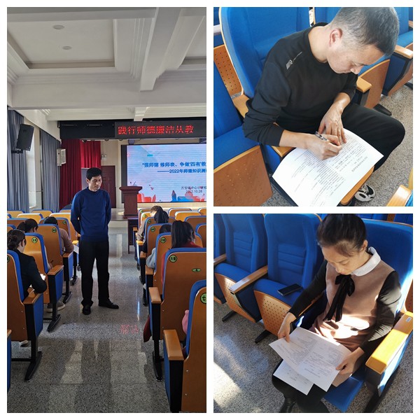本次测试主要以教师职业道德、专业知识、教育常识等方面知识为主;题型分为填空题、选择题、简答题和论述题;测试时间为40分钟。在本次测试前,万宝小学全体教师认真复习了教师职业道德规范等内容,这次测试是对教师学习结果的一次大检测;测试过程中,常明华校长进行测试监考,教师们认真研读了题目,经过了认真的思考,对测试卷进行了解答;测试结束后,学校师德师风领导小组组织专人对试卷进行认真批阅。