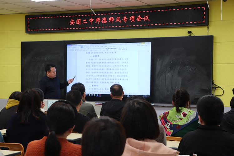 为进一步加强教师职业道德建设,以师风带学风、促校风、正行风,努力建设一支师德高尚、业务精湛、充满活力的高素质教师队伍,10月26日,安图县第二中学召开师德师风专项会议。会议由副校长崔青山主持,全体教职工参加会议。