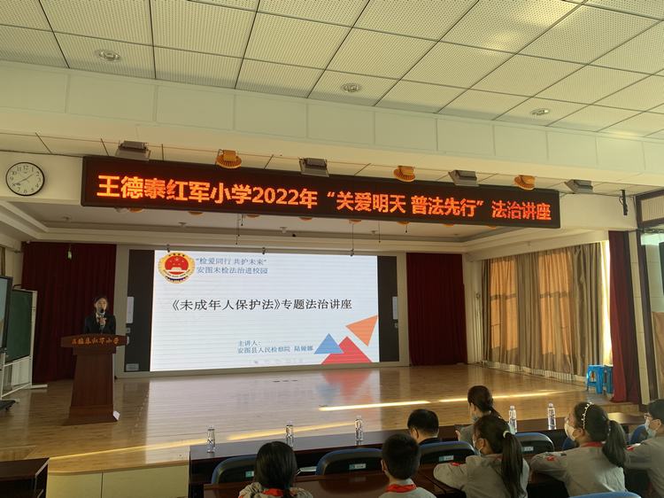 为增强学生的安全意识、法律意识,营造文明、平安、和谐的校园育人环境,10月26日,王德泰红军小学召开了关爱明天普法先行法制讲座。