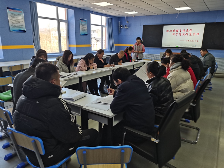 会议由负责各学年的主管领导主持,金校长及所有任课教师参加会议。主管领导们首先是对前一段时间的工作进行回顾,得出在三中的教师队伍中,没有老教师、没有弱者,只有永不服输的干饭人。在“学会与会学”的问题上,学年主管领导王乃红校长提出:老师们要在夯基础、补短板、重拔尖、能分层、共提高等方面多加思考,努力做到重效率、重效果、盯尖子、提中间、拉后边。