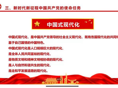 在此次党课上,七年级道德与法治教师李香从中国式现代化、全面建设社会主义现代化国家等方面着手,详细讲解党的二十大报告。李香老师讲到:中国式现代化,是中国共产党领导的社会主义现代化,既有各国现代化的共同特征,更有基于自己国情的中国特色,其具体表现为:中国式现代化不仅仅是人口规模巨大的现代化,也是全体人民共同富裕的现代化,更是物质文明和精神文明相协调的现代化。