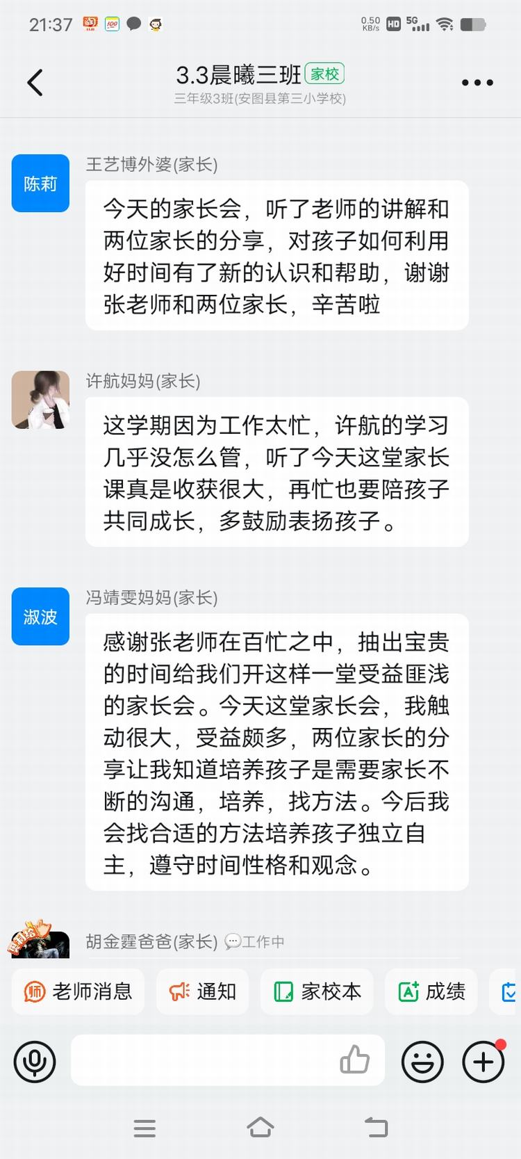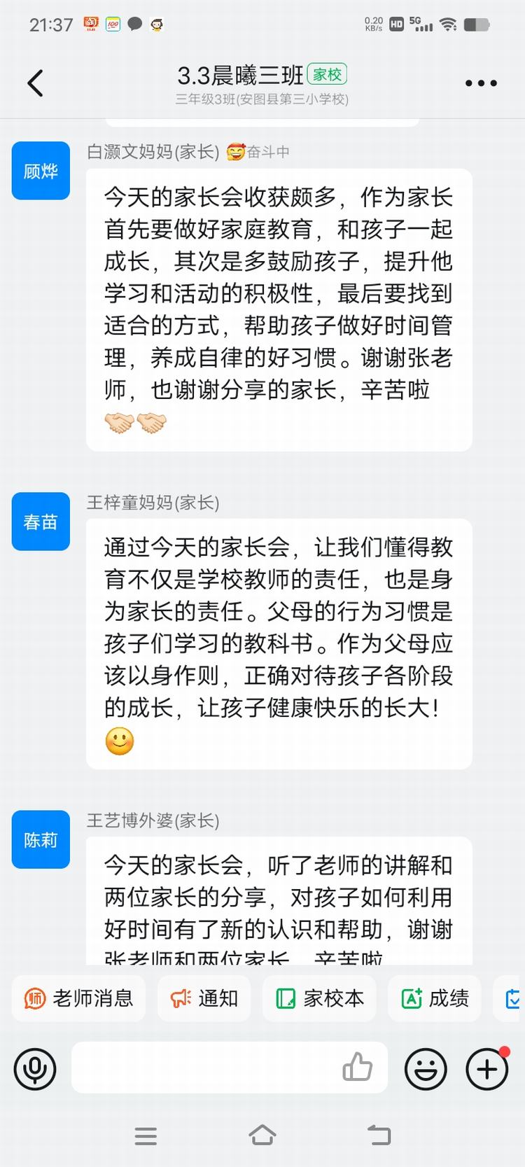 班主任和任课老师就学生开学以来的学习情况、行为表现进行总结,对存在的问题进行分析。三年三班《如何培养孩子的时间观念》、二年二班《如何引导孩子克服作业拖拉的毛病》、五年二班《好孩子--如何做时间的主人》等,各班根据不同年级学生的特点选择不同的主题对家长们进行家庭教育的正确引导鼓励家长要做学习型的家长,树立榜样,培养孩子良好的学习、行为习惯。同时积极关注孩子的心理变化,鼓励孩子努力,鼓励孩子点滴进步。三年三班王梓童妈妈表示:通过今天的家长会,让我们懂得教育不仅是学校教师的责任,也是身为家长的责任。父母的行为习惯是孩子们学习的教科书。作为父母应该以身作则,正确对待孩子各阶段的成长,让孩子健康快乐的长大!