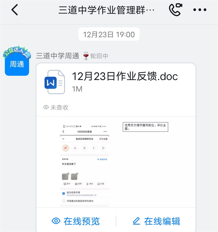 根据作业管理制度,老师对作业进行全批全改,批改标志正确规范、评语恰当,记录详实。每天在钉钉群中上传学生的作业反馈情况,其中包括作业批阅和学生完成情况,发现问题及时反馈,及时整改。