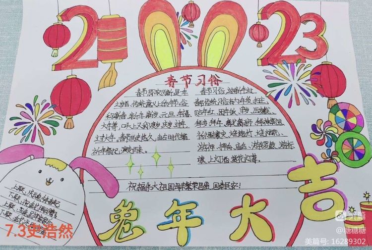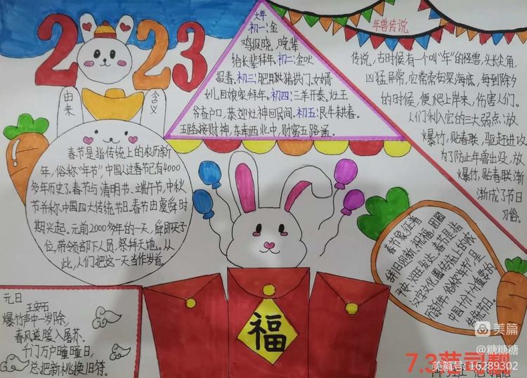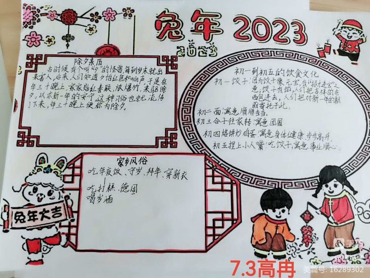 同学们十分用心,制作出了高质量的精美的手抄报,同学们纷纷表示通过手抄报的制作受益匪浅,更加了解了中国的传统节日-春节,同时也增强了爱国之情!祝愿2023祖国繁荣昌盛!