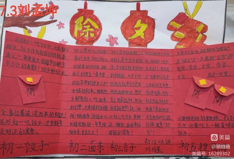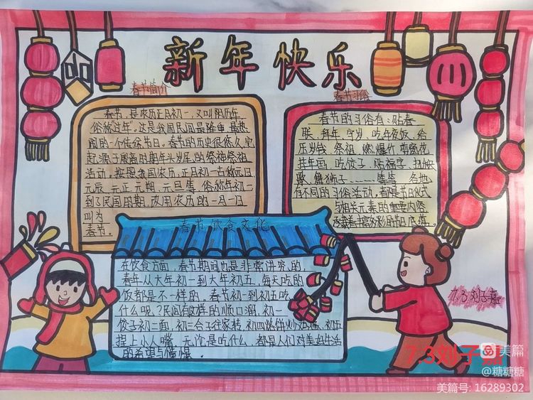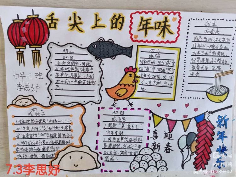 首先是“春节通关”手抄报,安图三中的学子们通过手抄报向大家介绍春节的习俗,他们先是收集了关于春节习俗的信息,其次进行信息整理筛选,最后开始进行创作和绘制。