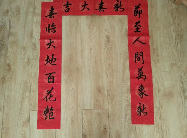 学校书法爱好者在校工会的组织下用行书、楷书、隶书、草书等形式,挥毫泼墨,为教职工们送上了一幅幅春联,一张张福字,也送上了一句句的祝福。“兔跃千山传喜讯,龙腾万里展英才”、“园丁辛苦一庭秀,桃李芬芳四海春”……春联既有挥别牛年、喜迎兔年辞旧迎新的美好愿景,也有平安吉祥、和谐发展的励志高歌。一幅幅喜庆吉祥、散发着墨香的春联给腊月增添了不少的年味。老师拿到福字和春联后赞不绝口,都说活动太有节日的氛围了。