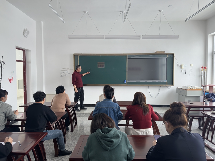 此次活动由学校书法教师朱长久进行讲解和指导。课上,朱老师首先提到了书写工具的不同以及如何选择。其后,分别从“二”“三”两个基本字的书写技巧、书写时的行笔方式、书写过程中的快慢轻重三个方面为教师们做出专业指导和示范。教师们积极地跟着练习,不懂之处还主动向老师提问,与老师交流互动,课堂气氛活跃。