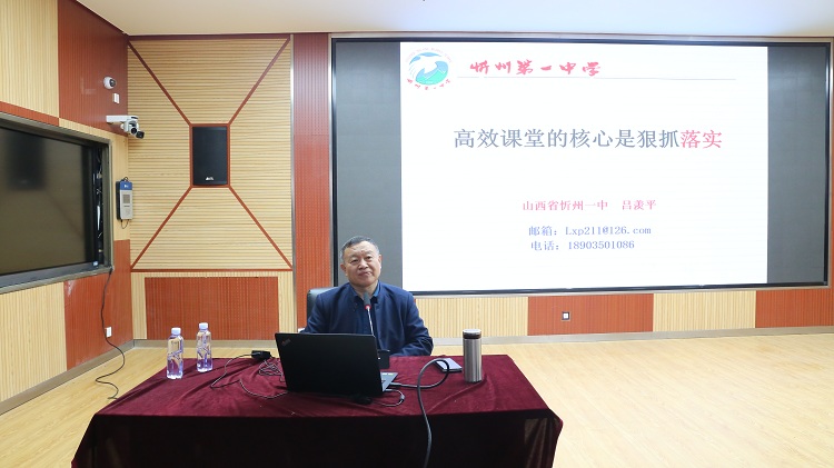 接着,吕羡平校长开始了他的分享,围绕着“如何把高效课堂做得更好”,他从五个方面进行了分享,分别是忻州一中课堂教学改革成绩展示、课堂教学理念的改变、让学生真正动起来的高效课堂、精准教研是课改的前提、目标引领,对标前行。他结合忻州一中多年来的教学数据和实例,语言深刻幽默,讲解深入浅出,引起了老师们深刻的思考和共鸣。