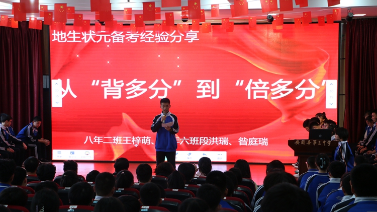 在嘹亮的国歌声中拉开帷幕后,学年主管王艳华主任分析前两届地生中考成绩,宣读中考政策。高玉琳和张鑫两位老师分别从课堂、作业、复习计划、心态调整等方面对接下来一百天的学习方法进行主要说明和指导,帮助同学们在有条不紊的节奏中迎接“地生中考”这一里程碑。接着,九学年地生状元分享备考经验,八年六班段宏瑞作为学生代表向全体同学发出冲刺地生中考的号召。呼吁同学们坚定信心,怀揣信念,稳步前行,科学备考;用汗水和拼搏铸就满意的答卷。