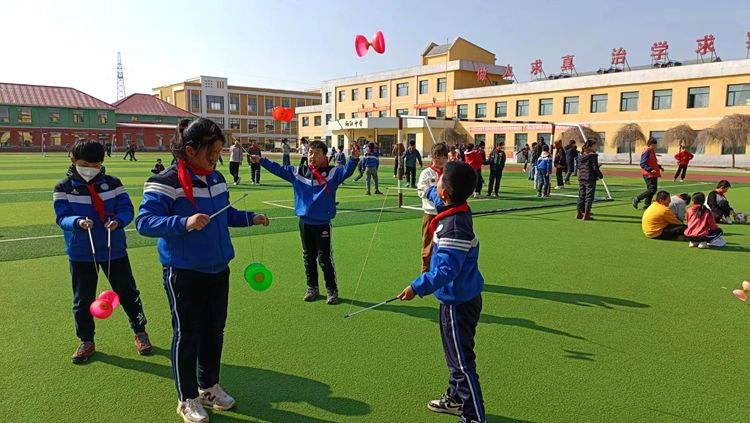 下课铃声一响,全校15个班级的同学在班主任老师的带领下,有序地站在各班规划好的区域内,并根据自选活动内容进行活动。操场上有的同学在跳绳,有的围成一圈进行足球传球练习,有的在跳大绳儿,有的在练习空竹......同学们尽情地享受着运动的乐趣,一张张笑脸、一阵阵欢声笑语让校园充满了生机与活力。
