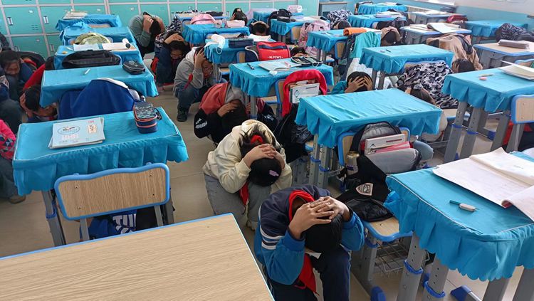 12日下午1点40分,地震警报响起,教室内的学生迅速将身体蹲下,双手抱头就近躲到桌子下方,以保护身体不被砸伤。大约1分钟后,师生按预定路线撤离教学楼,在各个楼层集合点都安排了相应工作人员,进行现场疏导。在安全区域集合并清点人数,确保不漏一人。演练按预案进行,历时38 秒。整个过程即紧张、激烈又有条不紊,圆满完成了此次紧急逃生疏散的演练任务。疏散演练活动结束后,两江小学校长牛建军对演练过程做了总结,并就本次演练出现的问题进行了强调,再次对学生进行了地震紧急逃生自救重要性的教育。他希望全体师生牢固树立起防灾避震的安全意识和自我保护意识。