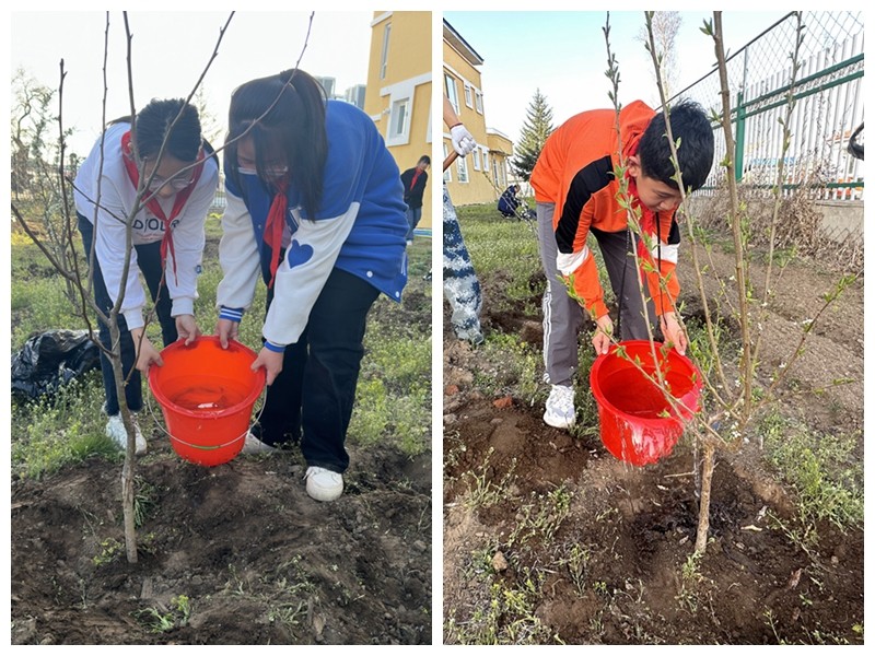 活动现场,学校师生一起参加植树活动,大家三五个人一组,有的挖坑,有的扶苗,有的培土,有的浇水。大家互相协作,认真完成每一道工序,现场呈现出一派火热的景象。经过两个小时的努力,大家圆满完成了校园植绿任务,把校园装点得更加春意盎然。