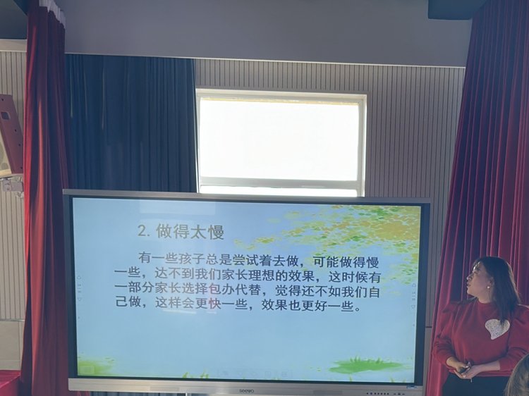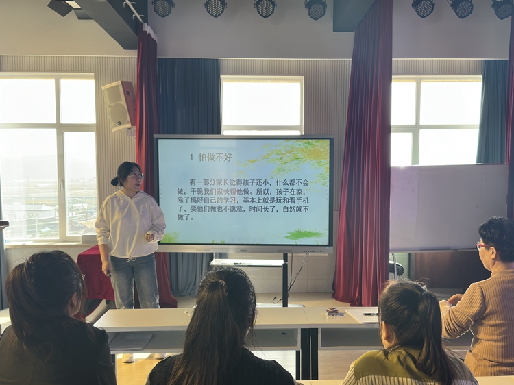 活动中,家校主讲团孟老师围绕“家长会注意事项”,从会前准备、会中推进、会后总结三个方面展开精彩的讲述,为全体教师上了一堂指导示范课--《如何提高孩子的自理能力》。孟老师以互动的形式向班主任们展示如何让家长正确提高孩子的自理能力,从而更好地引导教育学生最后,新教师们结合理论知识和班级实际情况,热火朝天地进行家长会课程试讲实操,为正式开展家长会奠定经验基础。