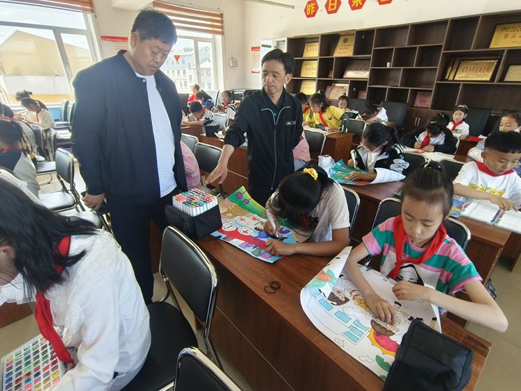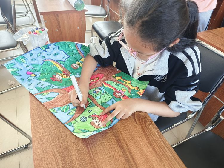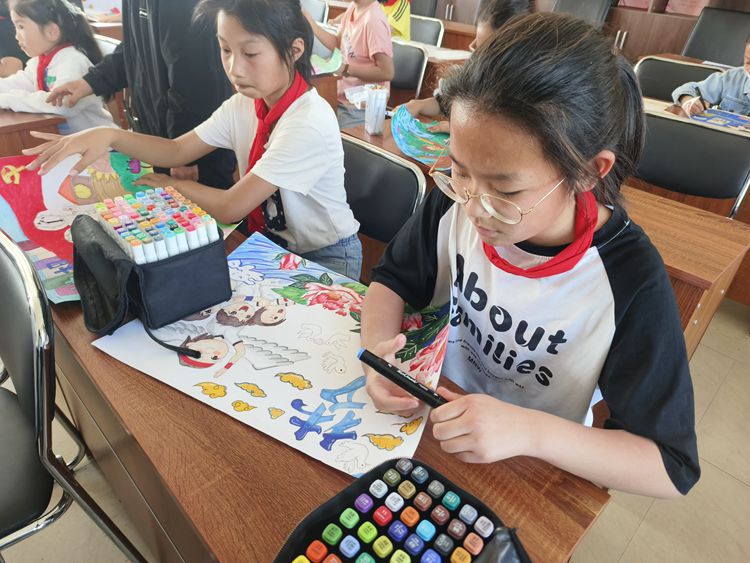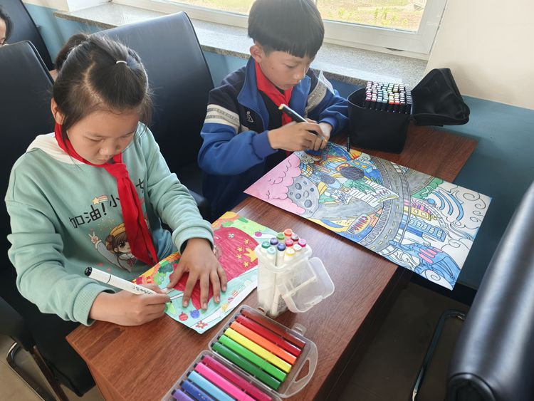 当老师强调绘画比赛要求后,同学们迫不及待拿起了画笔,纷纷拿出自己的看家本领,或凝思静想,笔在纸上不停比划;或精心勾勒,让画面丰富有趣;或笔走行云,流畅的线条显示出娴熟的技巧,畅快淋漓中尽显小画家本色……孩子们用手中的画笔描绘了他们美好幸福的童年生活,抒发了他们爱地球、爱祖国、爱劳动、爱生活的美好情感。