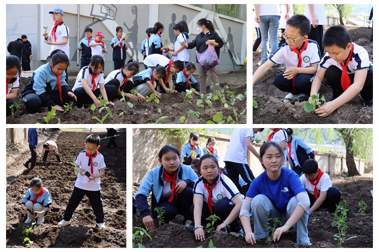 为了便于学生们的种植,后勤组的老师们提前进行了垄沟的翻新工作,并将采购好的农作物幼苗放置于过道两旁。在学校大队委员的统一安排下东风学校五至八年级的学生分批次来到菜园,在各年级划分好的区域分别种植辣椒、番茄、茄子等农作物。学生们脚踩土地,背对蓝天,俯下身子细心种植手中的农作物。一转眼的功夫,原本荒芜的土埂上,均匀地分布着充满绿色希望的幼苗。