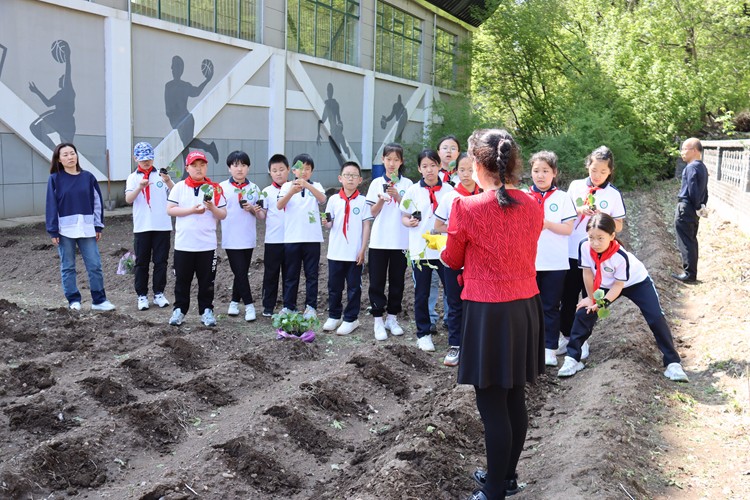 “把农作物幼苗捧在手心里,走到地垄上已经挖好的坑旁边,放入幼苗,之后压实周围的泥土就可以了”。5月18日下午,在东风学校的劳动实践基地里,老师们正在教导学生如何正确种植农作物。
