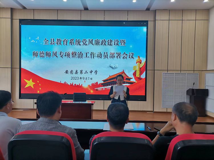 为贯彻党的二十大精神,全面落实教育部关于加强和改进新时代师德师风建设的要求,进一步严明工作纪律,严肃工作作风,营造风清气正的育人环境,9月1日,安图县第二中学召开师德师风专项整治工作动员部署会议。全校教师参会。