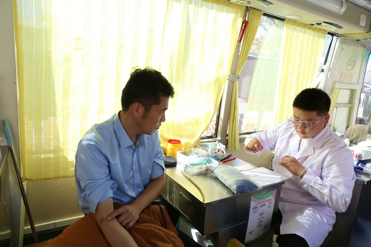 上午8点,献血车来到校园门口,老师们提早排好了长队,迎接献血车的到来,在医护人员的引导下,老师们认真填写献血登记表、测量血压,采血化验,最终有多名教师体检合格献出了自己的一份爱心。