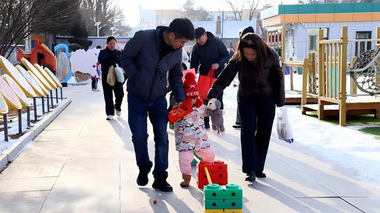 活动以“打卡入园”开启,幼儿与家长在贴有小马图案和福字的“雪饼福墙”触摸福字、合影,定格新学期美好瞬间。随后的趣味游戏环节精彩纷呈,“跳一跳福气到”“套住福气马”“小马送福”“喂马接福”四个游戏各有乐趣, 游戏结束后,家长与幼儿前往室内打卡区拍照留念,延续迎新氛围。活动中,教师耐心引导幼儿遵守规则,尊重幼儿意愿,全程做好安全保障与情绪安抚。